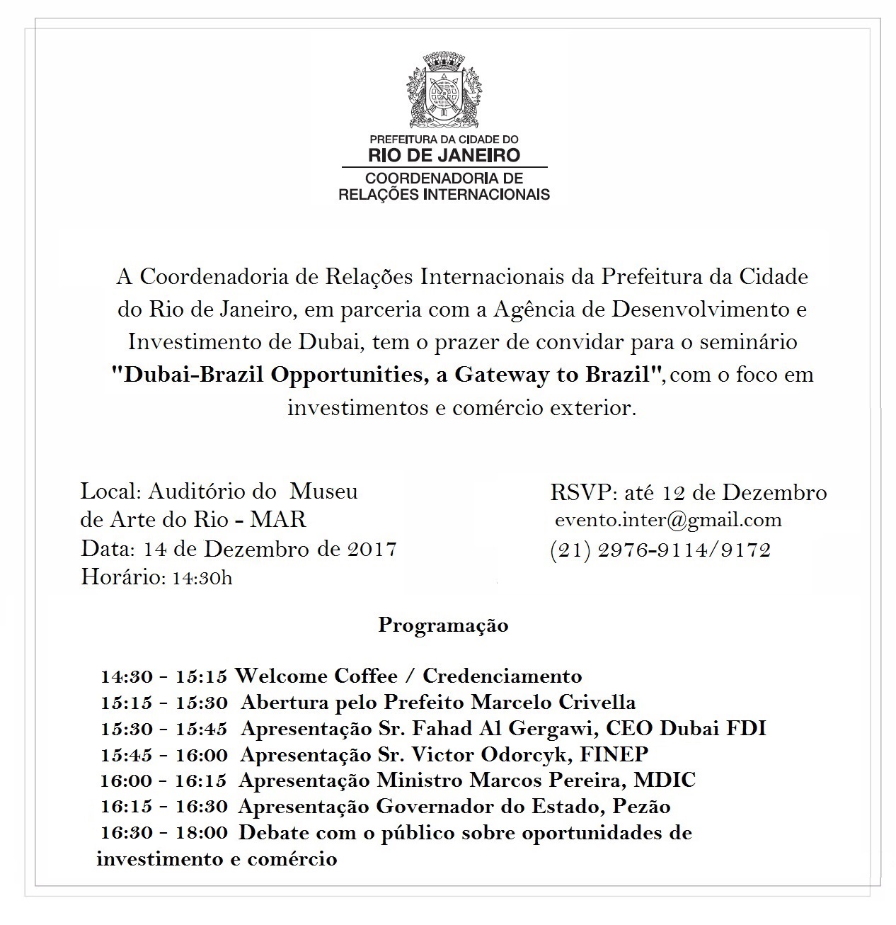 A Finep participa na quinta-feira, 14/12, do Seminário Dubai-Brazil Opportunities, a Gateway to Brazil – organizado pela Coordenadoria de Relações Internacionais (CRI) da Cidade do Rio de Janeiro, o órgão responsável por pautar e assessorar na elaboração e execução de políticas públicas municipais relativas à cooperação internacional. O evento acontece no auditório do Museu de Arte do Rio (MAR), a partir de 14 horas.