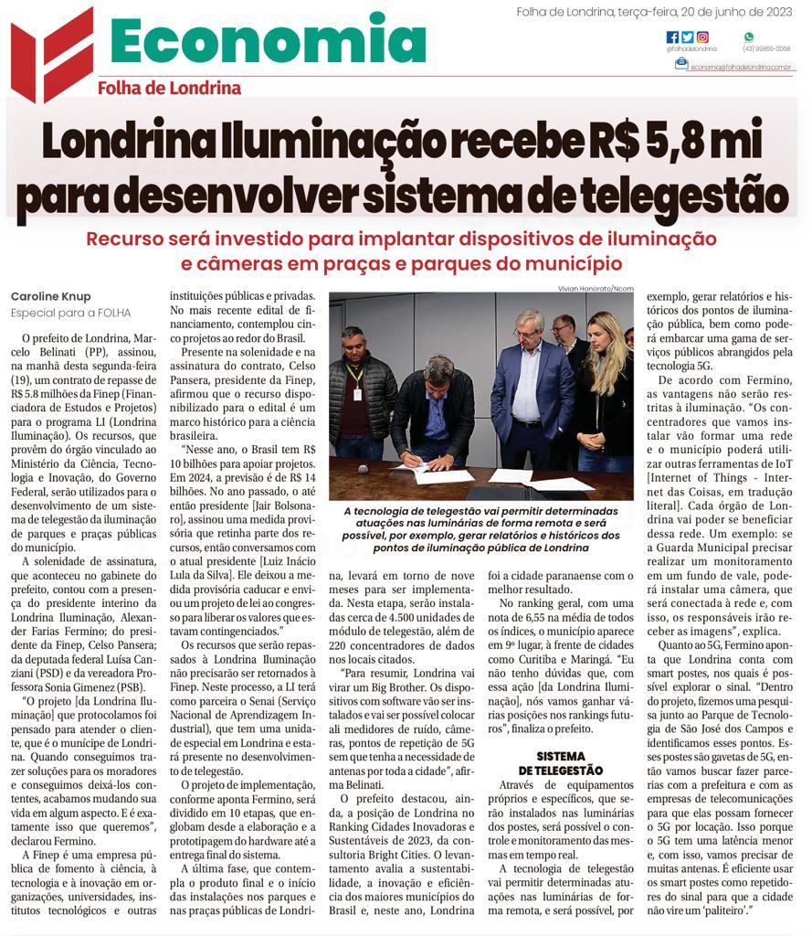 A assinatura de convênio entre a Finep, empresa pública do Ministério da Ciência, Tecnologia e Inovação, e a Londrina Iluminação (LI), na última segunda-feira (19 de junho), teve grande repercussão na imprensa regional. O jornal Folha de Londrina dedicou uma página inteira ao evento. A notícia também foi amplamente divulgada em blogs e sites especializados da região.